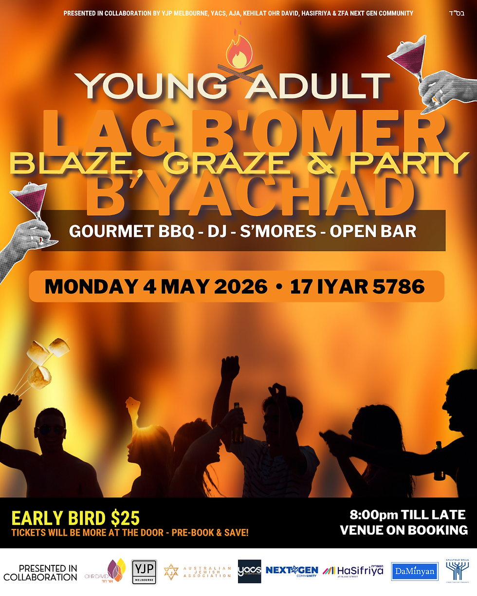 Presented in collaboration by YJP Melbourne, YACS, Australian Jewish Association, Kehilat Ohr David, Hasifiriya & ZFA Next Gen Community invite you for an epic Lag BāOmer celebration made for Melbourneās young Jewish adults.Ā